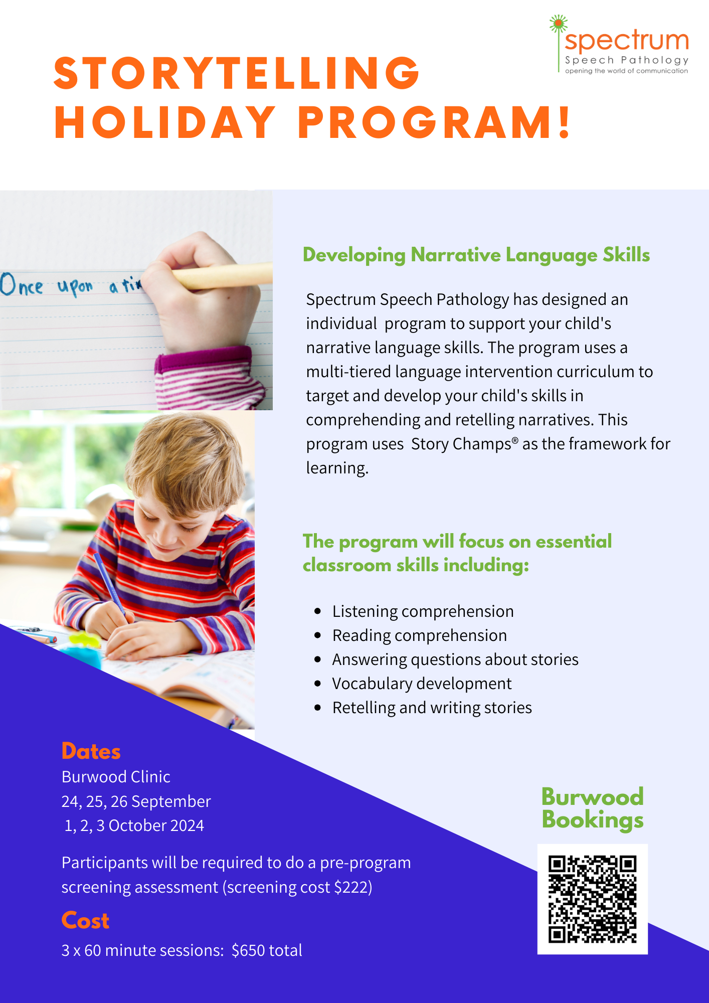 Spectrum Speech Pathology has designed an individual program to support your child’s narrative language skills. The program uses a multi-tiered language intervention curriculum to target and develop your child’s skills in comprehending and retelling narratives. This program uses Story Champs® as the framework for learning.